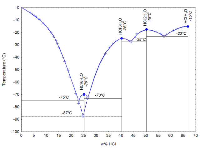 如下圖所示,鹽酸共有四個結晶的共熔點,分別對應四種晶體:68%(HCl的質量分數,下同)時的HCl·H2O、51%時的HCl·2H2O、41%時的HCl·3H2O和25%時的HCl·6H2O。另外在24.8%時還有一種亞穩的HCl·3H2O生成。