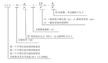 碳化硅換熱器設備型號由結構型式、公稱直徑、設計壓力、公稱換熱面積、公稱長度、換熱器外徑、管/殼程數、管束等級等字母代號組合表示。