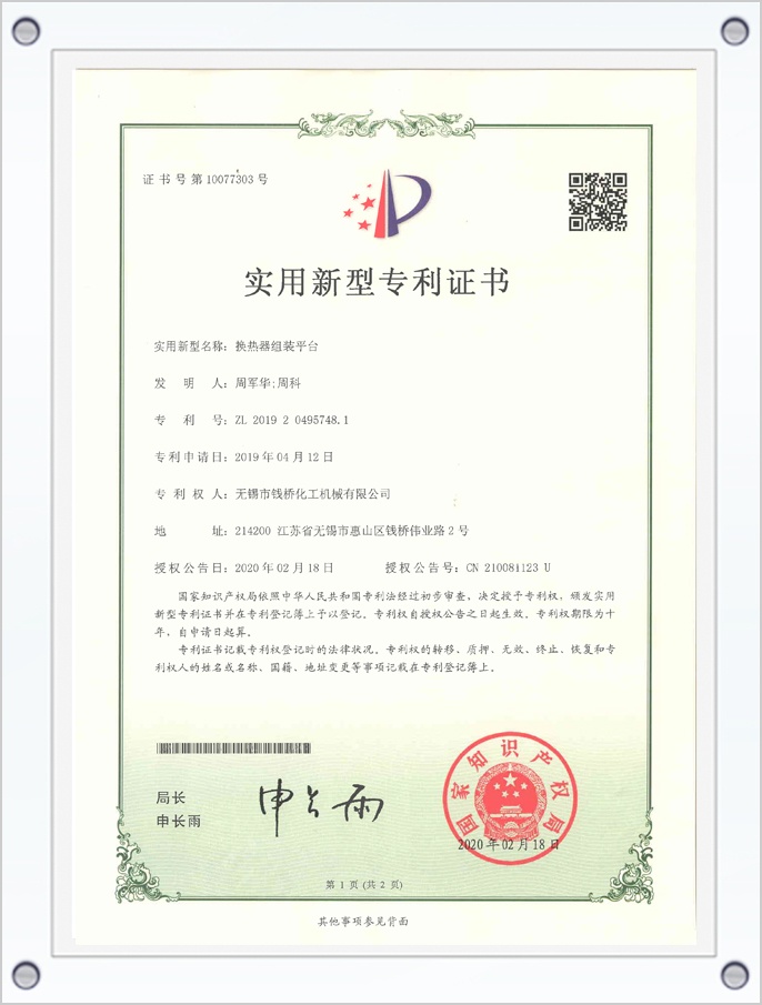 換熱器組裝平臺專利證書