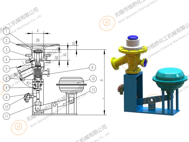 Bottom outlet valve (60°) gap free with pneumatic actuator(Side cylinder)搪玻璃上展式自動放料閥(側向執行機構) *內置測溫氣動放料閥.The inorganic acid, organic acid, weak alkali solution and organic solvent are superior to stainless steel in strong corrosive media such as hydrochlor